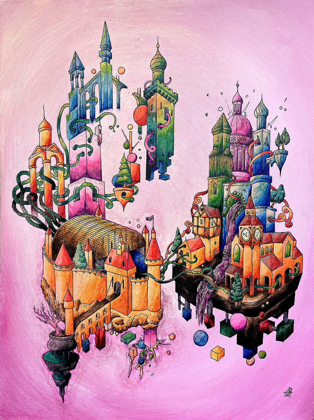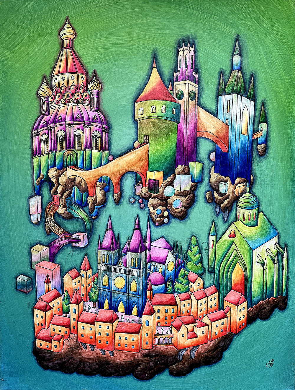 C’est une série de tableaux qui comporte pour l’instant deux créations de 60 par 80 centimètres : Astapone et Porenclave. Ces deux cités imaginaires sont des villes suspendues dans une sorte de vide spatial coloré. Elles présentent un mélange d’architectures classiques, médiévales, antiques et modernes, ainsi que des volumes abstraits. Le style de dessin choisi est un trait à la ligne claire et la couleur est réalisée avec des feutres à alcool qui permettent de nombreux effets de dégradés.
